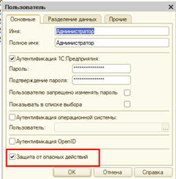 Самый простой способ отключения защиты от опасных действий – это снять в конфигураторе флажок в настройках пользователя: