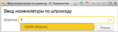 В дальнейшем при поступлении товаров позиции со штрихкодом можно добавлять в табличную часть документа по кнопке Добавить по штрихкоду (номер нужно ввести в соответствующее поле ввода):
