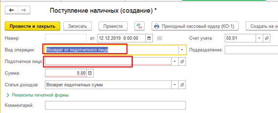 3. Если указан вид операции Возврат от подотчетного лица, то необходимо выбрать подотчетное лицо из справочника Физические лица: