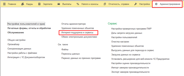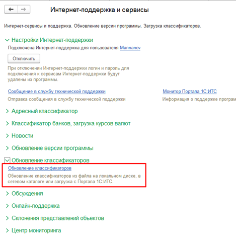 Чтобы загрузить файл, надо перейти в раздел Администрирование – Интернет-поддержка сервисы – Обновление классификаторов: