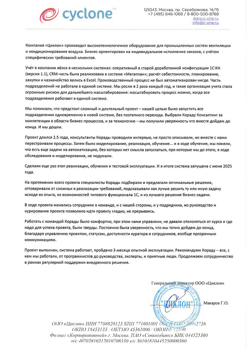 Мы понимали, что предстоит сложный и длительный проект - нашей целью было запустить все подразделения одновременно в новой системе, без поэтапного перехода. Выбрали Кораду Консалтинг за компетенции в области бизнес-процессов, и за технологию - мы получили уверенность что вместе дойдем до конца. И мы дошли.
